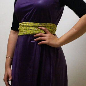 שמלה סגולה עם חגורה צהובה פרחונית מתאים לכיתות ב׳-ו׳